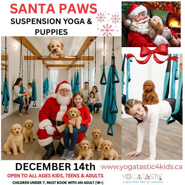 That’s right—an entire litter of adorable puppies is taking over our Suspension Puppy Yoga studio, and this time… they’re bringing Santa with them.